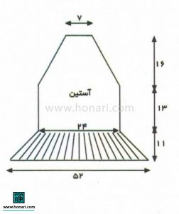 ۱۴۵ دانه سراندازي شده را به اندازه ۱۱ سانتیمتر مانند قسمت جلوی لباس میبافیم. در این قسمت از روش “۹ تا زیر، ۳ تا رو” استفاده میکنیم. سپس ۴۸ دانه باقیمانده را به اندازه ۱۳ سانتیمتر به صورت بافت ساده ادامه میدهیم. برای تشکیل حلقه آستین، از دو طرف مانند روشی که در قسمت جلو و پشت انجام دادیم، دانهها را کم میکنیم. وقتی قد بافت به ۴۰ سانتیمتر رسید، همه دانههای باقیمانده را با هم میبندیم.