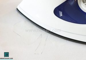 حالا طرح را در جای دلخواه روی لباس قرار میدهیم. سپس با حرارت بسیار پایین اتو میکشیم. این کار فقط برای این است که طرح کاملاً صاف روی لباس بنشیند. توجه کنید: اگر از ورقه محافظ (طلق) استفاده میکنید، هرگز اتو را مستقیماً روی آن نگذارید.