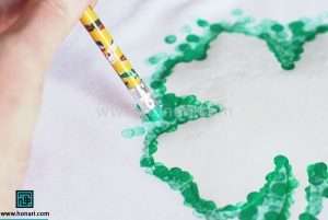 در این مرحله، نوک مداد را داخل رنگ مخصوص پارچه فرو میبریم. سپس، به آرامی و با ضربههای نرم، از روی طرحی که کشیدهاید رد میشویم. هرچه از خطوط اصلی طرح فاصله میگیریم، ضربهها را سبکتر میزنیم تا رنگ به تدریج کمرنگ و محو شود.