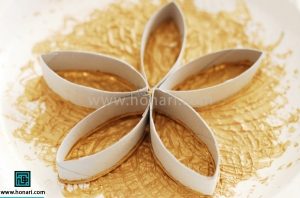ابتدا لوله مقوایی را از طول به پنج تکه کوچک تقسیم میکنیم. سپس هر تکه را با دست به شکل بیضی درمیآوریم، طوری که شبیه گلبرگ شود. بعد این گلبرگها را کنار هم میچینیم و همه را به یک نقطه مرکزی میچسبانیم تا شکل یک گل کامل به دست آید.