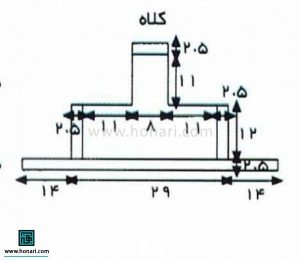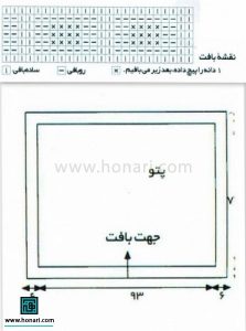 – وقتی قد کار به ۱۴.۵ سانتیمتر رسید، ۱۸ دانه وسط را به روشی که در نقشه مشخص شده میبافیم و بقیه دانههای دو طرف را در هر رج، از هر طرف، دو دانه کور میکنیم.