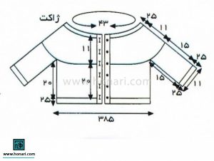 **ژاکت:** ابتدا ۷۴ دانه سر میاندازیم و ۶ رج رکن میبافیم. سپس از هر دو طرف، ۶ دانه را به صورت رکن ادامه میدهیم. در قسمت سمت راست، با فاصلههای تقریباً ۵ سانتیمتری، ۶ جای دکمه ایجاد میکنیم.