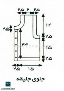 **بخش جلوی لباس (جلیقه):** ابتدا ۴۲ دانه سر میاندازیم. سپس ۶ رج به روش رکن میبافیم. بعد از آن، از یک سمت، ۶ دانه را برای قسمت سجاف (حاشیه داخلی) به صورت رکن ادامه میدهیم. ۳۶ دانه باقیمانده را مطابق طرح و نقشه، به مدت ۱۵ سانتی متر میبافیم. سپس برای ایجاد جای بازوی (حلقه آستین)، از همان سمت، ۶ دانه جدید اضافه میکنیم. این ۶ دانه را نیز در ادامه، به سبک رکن میبافیم و دانههای بخش میانی را طبق نقشه پیش میبریم.