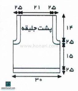 پشت جلیقه: ابتدا ۷۰ دانه سر میاندازیم. سپس ۶ رج رکن میبافیم. بعد از آن، به اندازه ۱۵ سانتیمتر مطابق نقشه پیش میرویم. قسمت حلقه آستین را هم مانند قسمت جلوی کار درست میکنیم. وقتی قد کار به ۳۴ سانتیمتر رسید، دانهها را میبندیم.