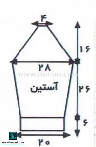 وقتی قد کار به ۳۱ سانتیمتر رسید، برای فرم دادن به حلقه آستین، از هر دو طرف، بعد از هر ۸ رج، یک دانه کم میکنیم. زمانی که قد بافت به ۴۷ سانتیمتر برسد، همه دانهها را یکجا میبندیم و کار را تمام میکنیم.