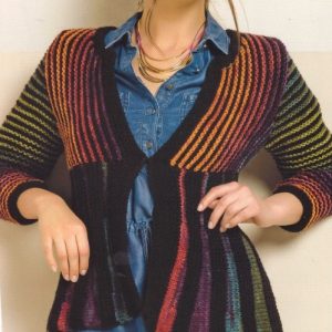 آستین: با نخ مشکی ۳۶ دانه سر میاندازیم و سه رج رکن میبافیم. سپس با نخ اسپورت یک رج و بعد با نخ مشکی یک رج دیگر رکن میبافیم. در هر ۶۰ رج که رنگها را عوض میکنیم، از دو طرف یک دانه اضافه میکنیم. وقتی قد کار به ۳۰ سانتیمتر رسید، برای قسمت حلقه آستین، ابتدا ۳ دانه، سپس ۲ دانه و بعد ۱ دانه را میبندیم. در هر ۶۰ رج رنگبندی، از دو طرف یک دانه کم میکنیم. وقتی ۸ دانه باقی ماند، همه دانهها را میبندیم.
