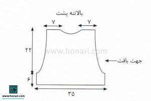 ۲۶ دانه دیگر اضافه میکنیم و ۱۰ رج به صورت رکن میبافیم. برای ایجاد فرورفتگی یقه در قسمت پشت، ۳ دانه را میبندیم. سپس ۱۷ رج رکن میبافیم. بعد از آن، ۳ دانه اضافه میکنیم و ۱۰ رج دیگر رکن میبافیم. حالا ۲۶ دانه را میبندیم. در ادامه، به روش ۱+۱+۱ دانهها را کم میکنیم (یعنی در هر مرحله یک دانه میبندیم). بعد از آن، ۵ رج رکن بافته و در نهایت همه دانهها را یکبهیک میبندیم.