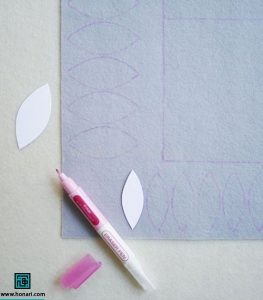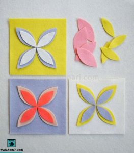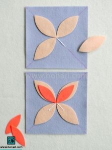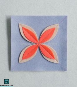 ابتدا روی نمد، دو مربع به اندازهی مورد نظرتان برای درست کردن بدنهی کوسن بکشید. برای تزیین هر مربع، از الگویی استفاده کنید که چهار گلبرگ بزرگ و چهار گلبرگ کوچک دارد.