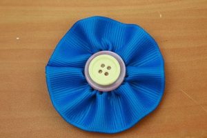 انتهای نخ را محکم گره بزنید. سپس دو سر روبان را با چسب حرارتی به هم بچسبانید تا به شکل یک گل درآید.