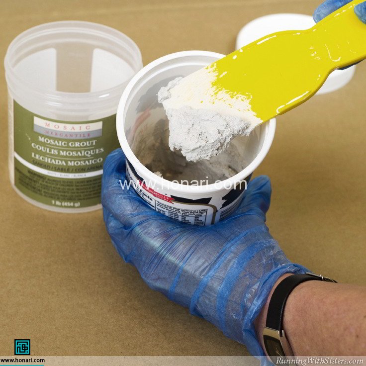 بعد از اینکه چسب کاملاً خشک شد و کاشیها به خوبی در جای خود ثابت شدند، با یک کاردک مقداری ملات برداشته و آن را روی سطح مورد نظر پخش کنید.
