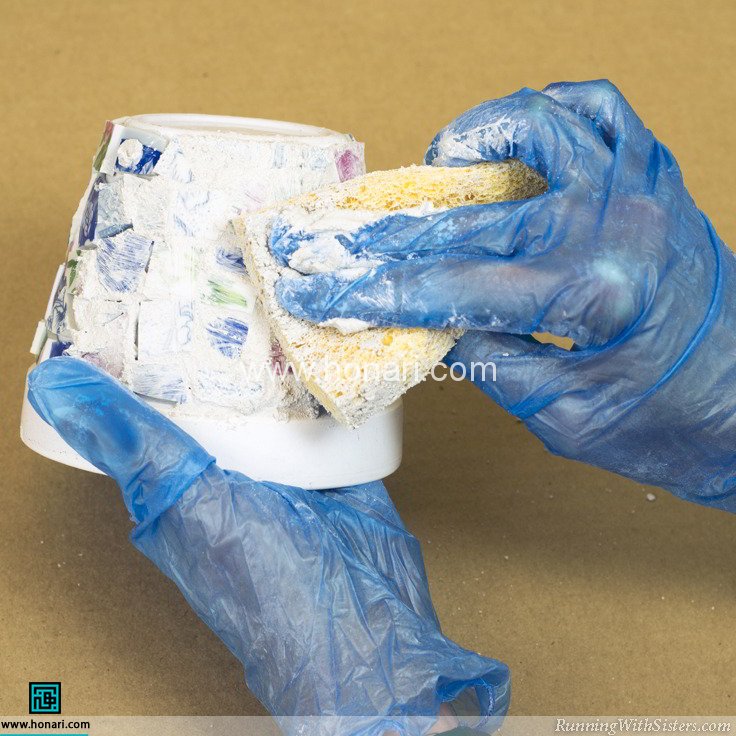 با چسب، تکهها را روی بدنه گلدان محکم بچسبانید.