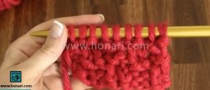رج بعدی را دقیقاً به همان شکلی که هست ببافید: دانههایی که رو هستند، رو ببافید و دانههایی که زیر هستند، زیر ببافید.
