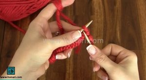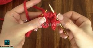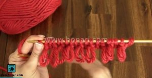 – دانه اول را مانند حالت معمولی ببافید (توجه کنید که فقط در همین رج اول، دانه اول بافته میشود. در رجهای بعدی، این دانه را بدون بافتن به میل دیگر منتقل میکنیم).
