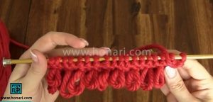 – برای دانههای زوج (مثل دانه دوم، چهارم، ششم و…)، میل را از پشت به داخل دانه وارد کنید (مانند روشی که در تصویر نشان داده شده است) و سپس آن را ببافید.