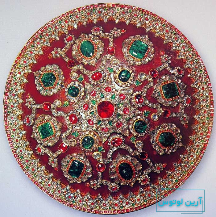 سپر تاریخی نادرشاه با دقت و هنرمندی بسیار ساخته شده و سطح آن با سنگ‌های گرانبها و درخشان، از جمله زمرد، آراسته شده است.